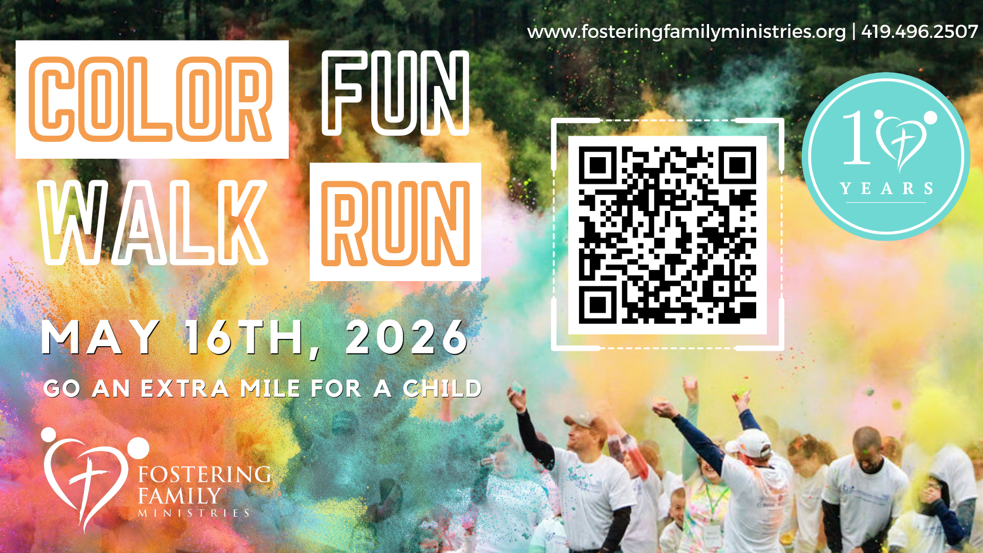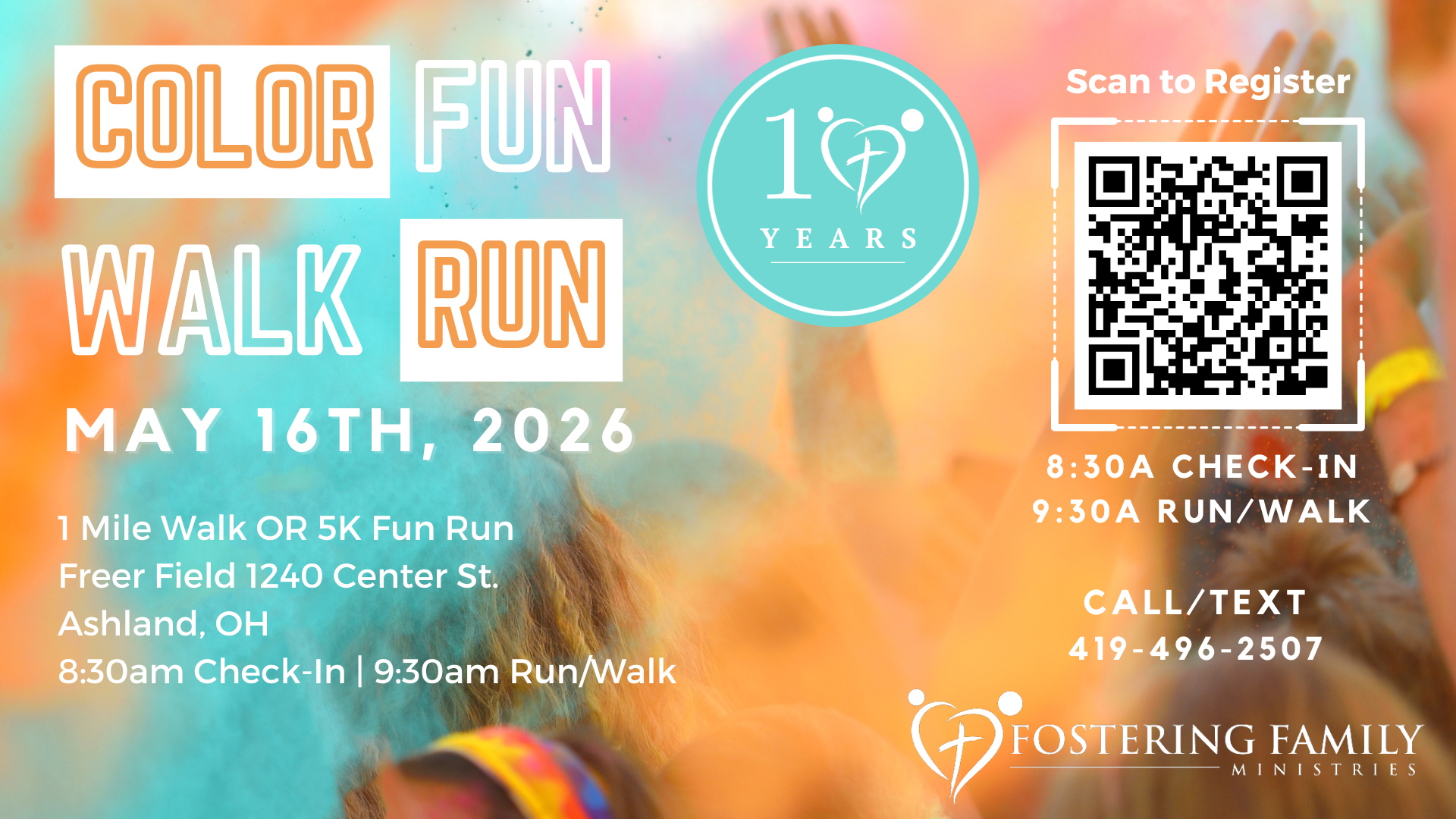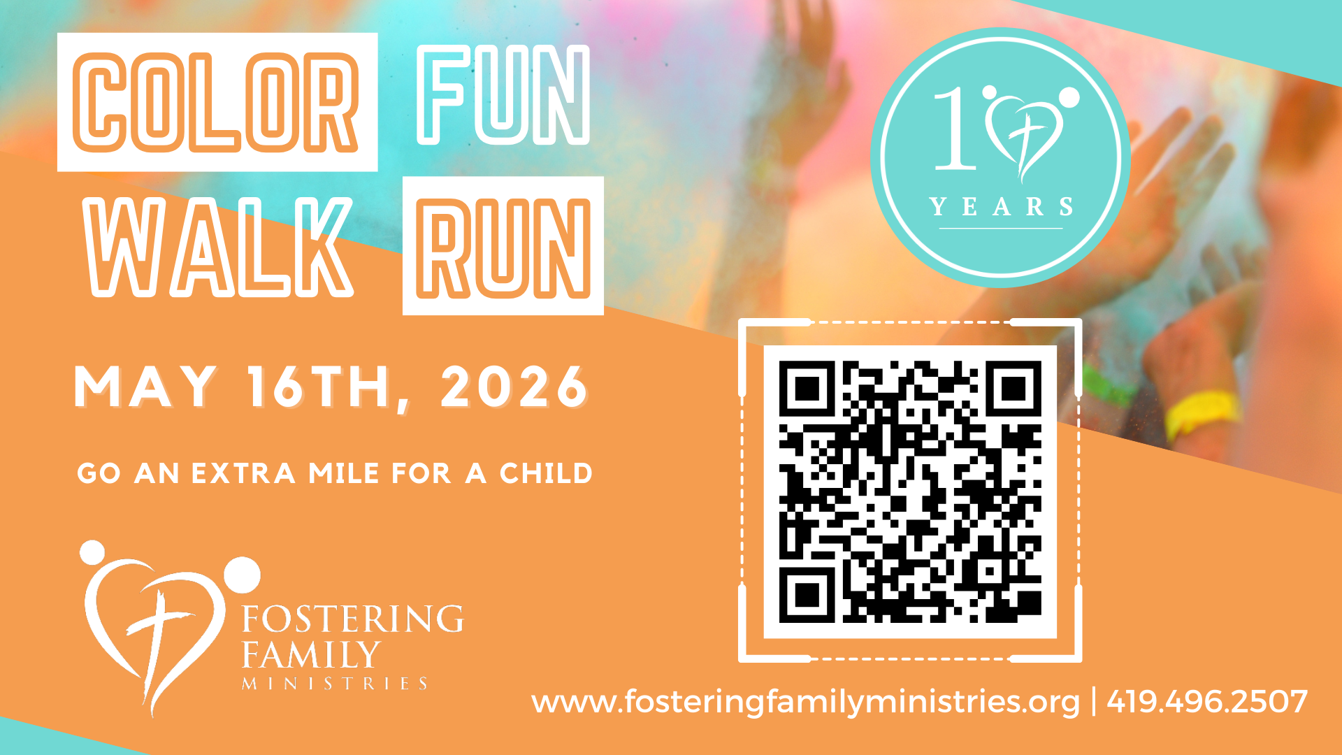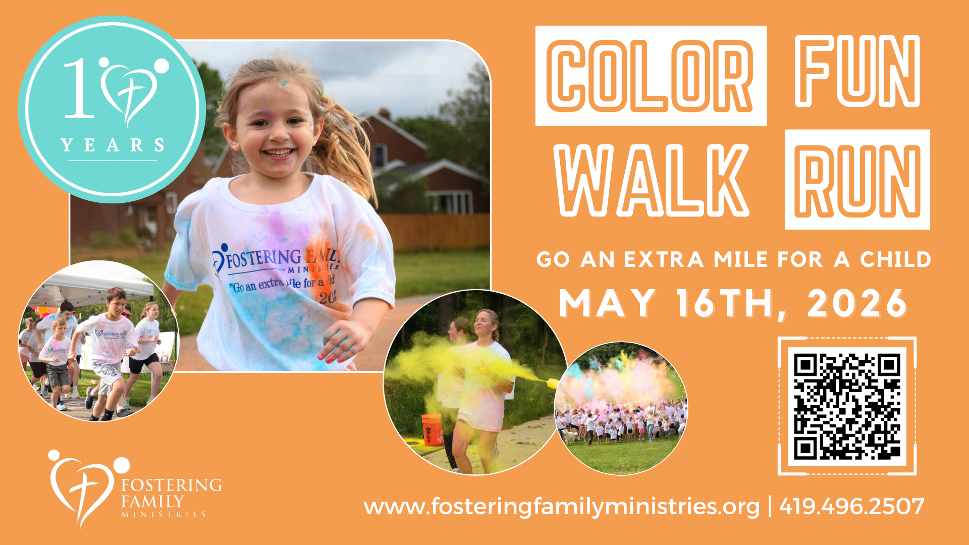 Color Fun Walk/Run 2026 is on May 16th, 2026! Join us to celebrate 10 years of ministry and highlight what the Lord is doing in foster care. Register to run or walk, but walk-ups are welcome! Sponsorship opportunities are available.